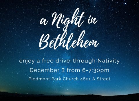 Piedmont Park Church invites you to "A Night in Bethlehem" to experience our live Christmas Nativity. This live drive-through Christmas Nativity will be a tour starting at our A Street entrance. As you drive-through each station you can listen and watch actors share the Biblical story of Christ birth through different scenes from the first Christmas.